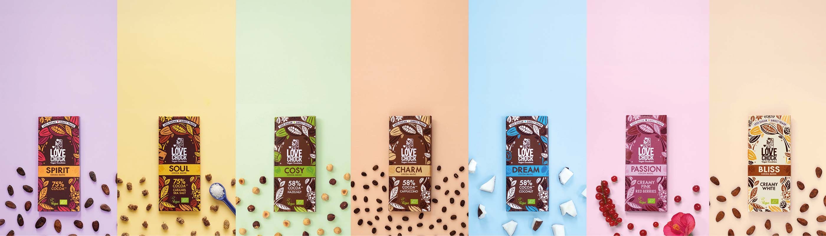 Lovechock est 100% biologique, s'intègre merveilleusement bien dans un régime végétalien, contient des flavonoïdes et est sans lait, sans soja et sans gluten. "Pas de sucre raffiné" fait partie de notre mission. Notre chocolat est sucré à l'inuline et nous en utilisons aussi peu que possible. De plus, tous nos emballages sont certifiés "compostables à domicile" depuis 2011. Oui, même le film transparent est composé de cellulose de bois qui se décompose en 90 jours seulement dans votre compost domestique.