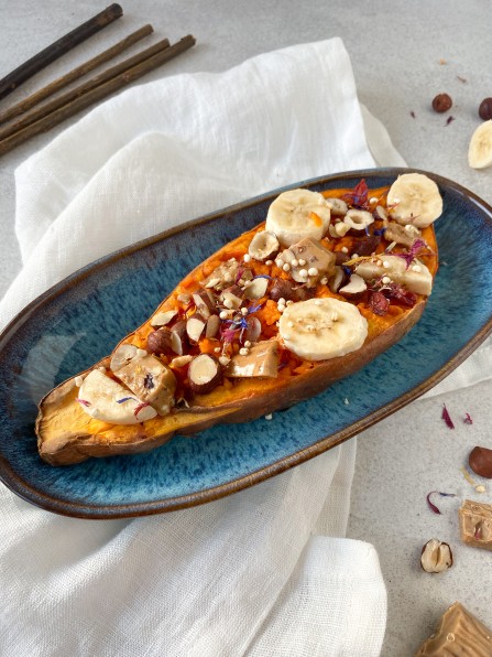 Préchauffer le four à 180°C. Cuire la patate douce jusqu’à ce qu’elle soit tendre ou jusqu’à ce qu’on puisse piquer le centre avec une fourchette, entre 40 et 50 minutes.