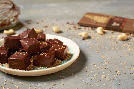 Couper la mixture de cajou refroidie en cubes de 2 cm. Hacher le reste du chocolat et le faire fondre doucement au bain marie. Mettre le chocolat fondu dans un petit verre, tremper les cubes de nougat un par un dans le chocolat liquide et laisser sur une plaque avec du papier anti-adhérant. Parsemer de graines de sésame pendant que le chocolat est encore liquide et laisser reposer pour que le chocolat durcisse.