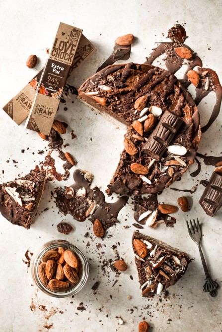 - Mettez le chocolat fondu dans une poche à douille et décorez le gâteau avec le chocolat liquide en lignes. Ajoutez des amandes pour décorer. Vous pouvez aussi en hacher quelques-unes. Si vous voulez que ce soit encore plus chocolaté, vous pouvez rajouter des morceaux de chocolat et/ou du chocolat râpé.