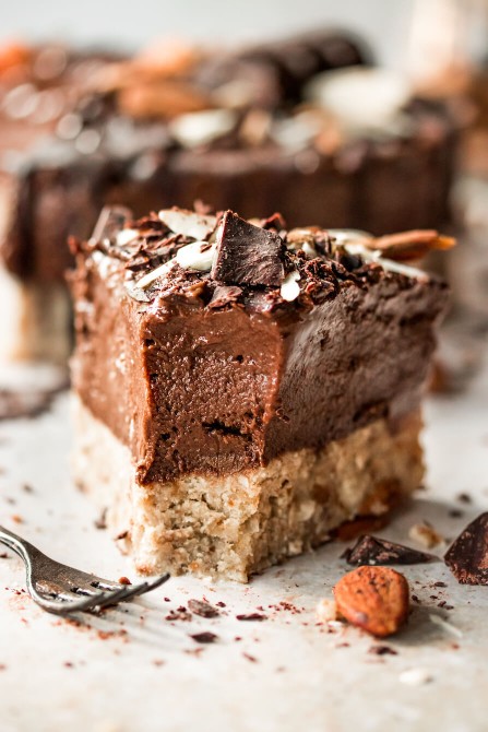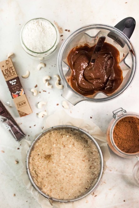 - Préparez le nappage. Mettez les dattes, les 3 bananes, le cacao en poudre et le lait d’amandes dans le robot de cuisine et mixez jusqu’à obtenir un appareil crémeux. Rajoutez ensuite la farine d’amande pour que l’appareil épaississe. Mettez ensuite le nappage sur la base dans le moule.