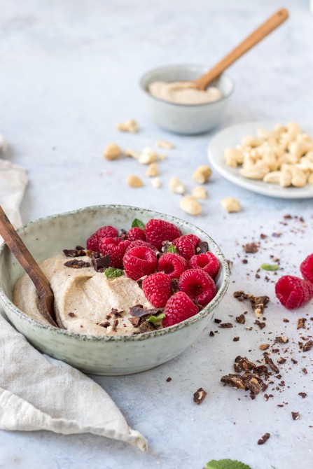 4. Présentez le yaourt de cajou dans une coupelle et garnissez de framboises, de chocolat haché en petits morceaux et de menthe fraîche.