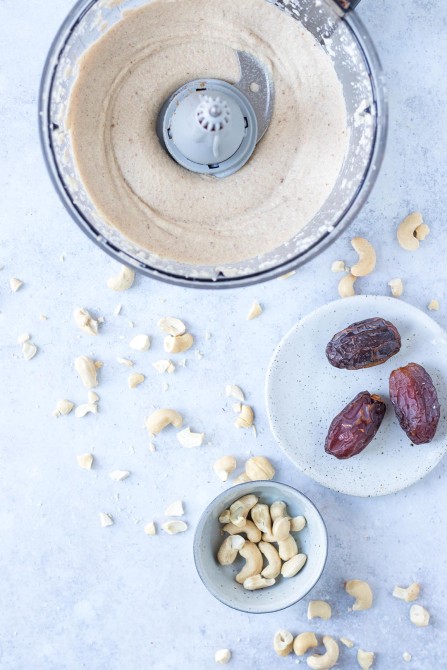 3. Mettez les noix de cajou avec l’eau, les dattes Medjool et l’extrait de vanille dans le robot de cuisine. Mixez pendant 7 à 10 minutes jusqu’à obtenir une texture lisse et crémeuse.